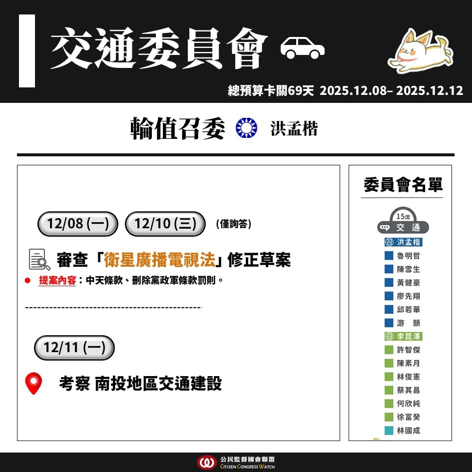 立法院國民黨團上週將攸關「中天條款」的黨團版「衛星廣播電視法部分條文修正草案」逕付二讀,不過,立法院交通委員會召委洪孟楷今(8日)仍排審其他立委的版本草案(僅詢答)