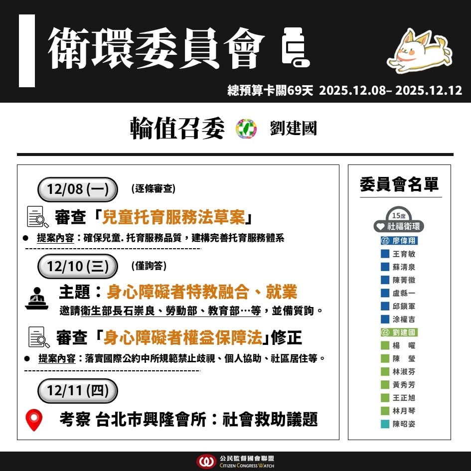 本週三(10日)社福衛環委員會召委劉建國,也安排專案報告,以及《身心障礙者權益保障法》審查。