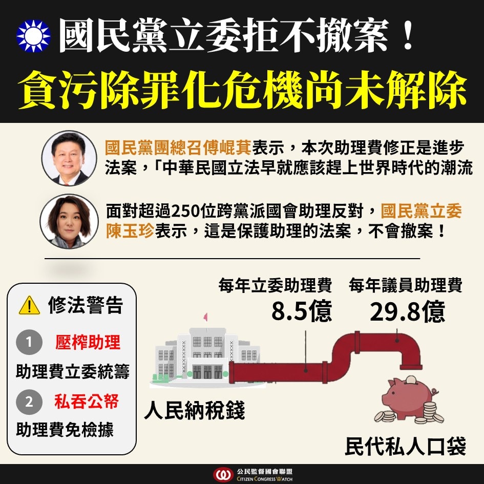 國民黨立委陳玉珍領銜,並聯合:林思銘、鄭正鈐、徐欣瑩、謝龍介、蘇清泉、張嘉郡、楊瓊瓔…等多位意圖角逐縣市首長的立委,共 28 位立委提案、連署要推動「民代貪汙助理費除罪化」,企圖將每年8.5億的立委助理費、以及 29.8 億左右的地方議員助理費,合計近 40 億的人民納稅錢,變成民代可以自由支配、免檢據、免問責的私人小金庫。