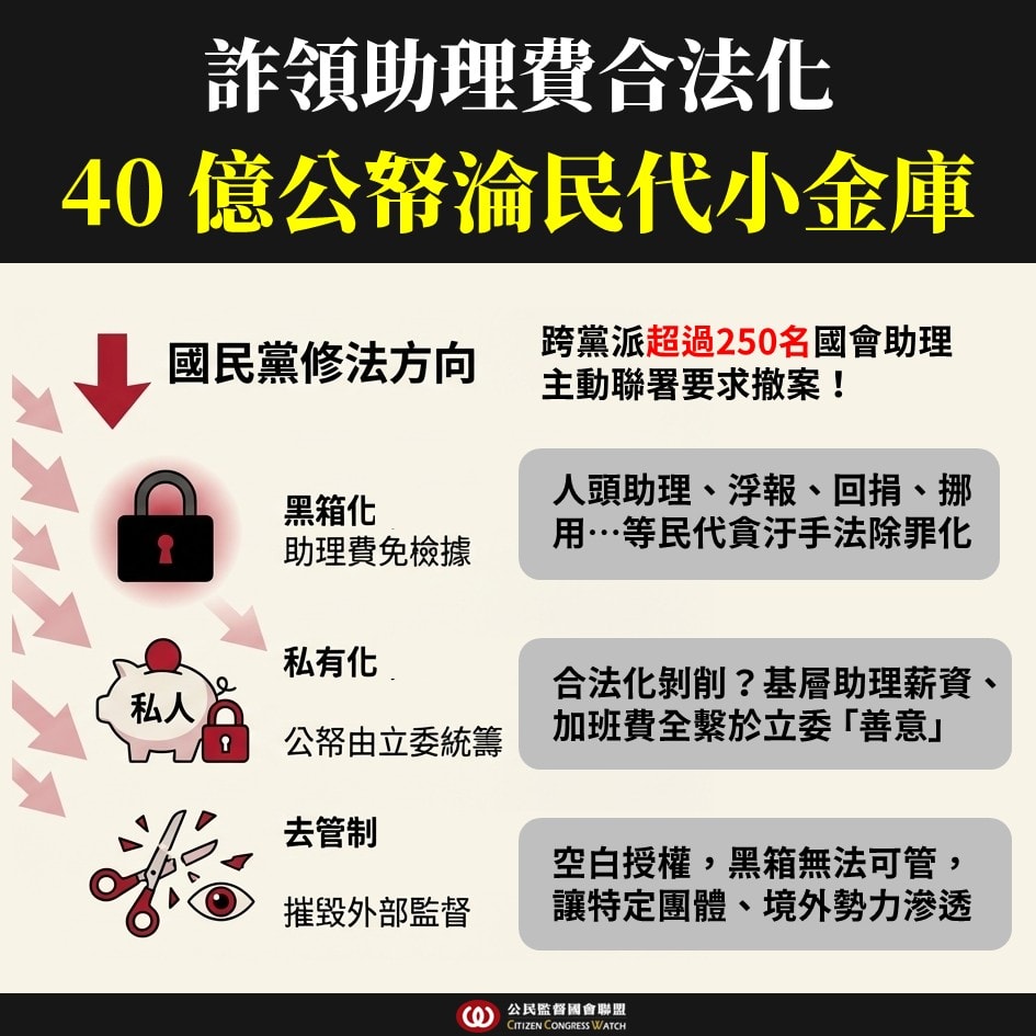 🚨 此外,對整個國家來說,這項修法帶來的衝擊遠比你想像的更為巨大,每年近 40 億元的助理費,將完全脫離審計、脫離查核,變成沒有紀錄、沒有憑證、沒有軌跡的黑箱金流,除了讓公民更難以追查用途外;在中國紅色滲透加劇的情勢下,更直接放大外部勢力介入的風險。