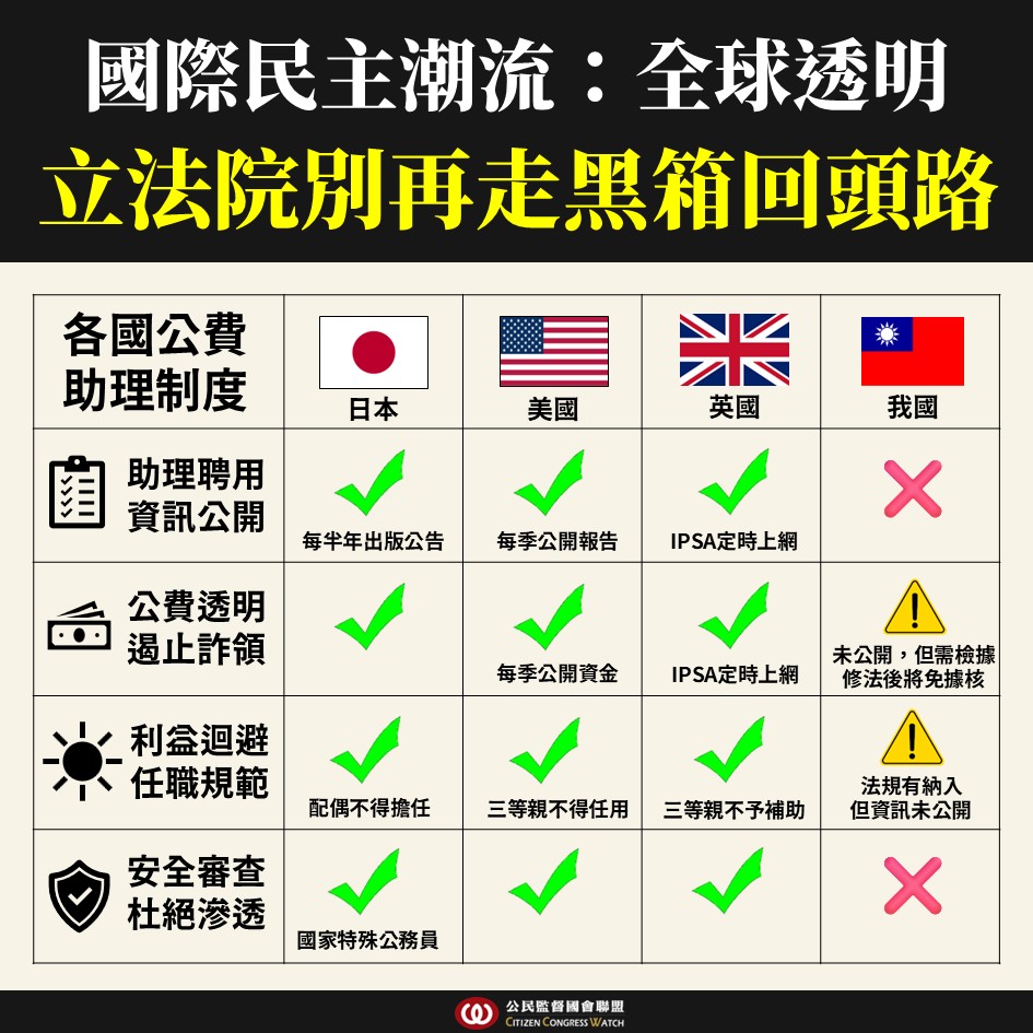 公督盟主張:助理名冊、職務內容、薪資結構、聘任關係,應比照美、日國會全面公開,讓公費去向可被監督、也能避免白手套助理充斥國會。