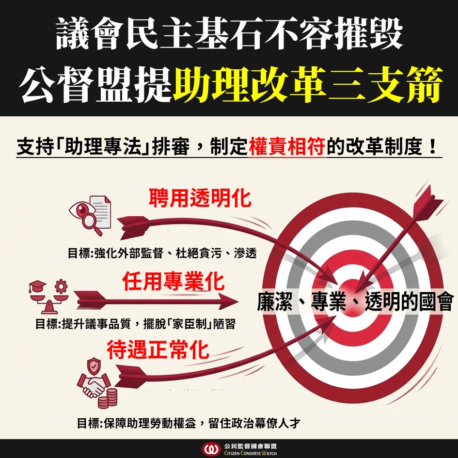 公督盟強調:真正的改革絕不是把監督拆掉,而是讓制度更加透明、更加專業、更加保障基層助理。為此,公督盟倡議「助理制度改革三支箭」: