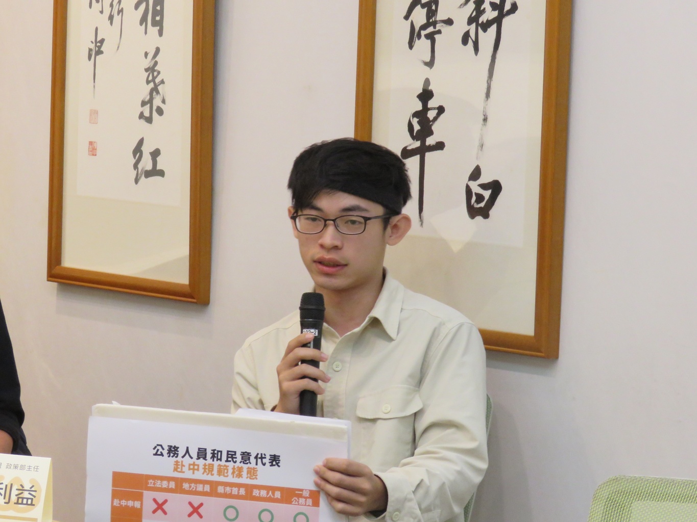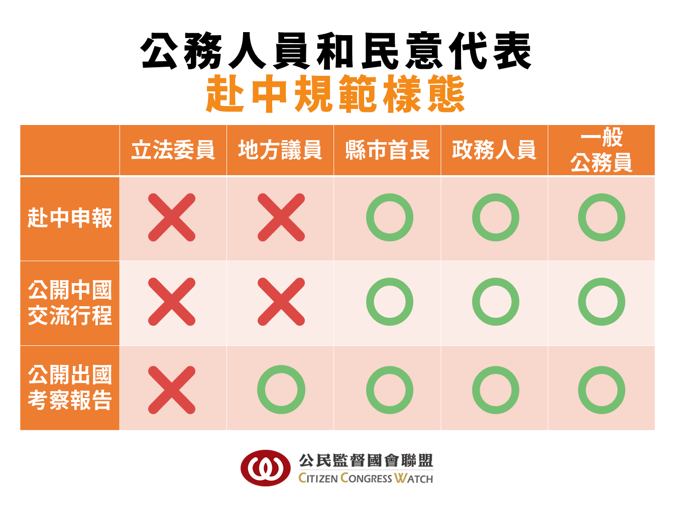 公督盟政策部主任陳利益強調,開大門走大路,立委出國交流本身並非問題,民主社會也不應禁止正當交流,但真正的問題在於,立委身為國家重要公職人員經常接觸國家預算、國安法制,與其他敏感政策資訊,在兩岸關係高度緊張的情勢下,民意代表卻享有特權,赴中、港、澳不必事前申報,甚至無須公開行程與目的,讓公民社會難以監督!公督盟呼籲國民黨立委別再惡意阻擋《兩岸人民關係條例》,應盡速建立民意代表赴中資訊揭露機制,以免造成國安破口進一步擴大!