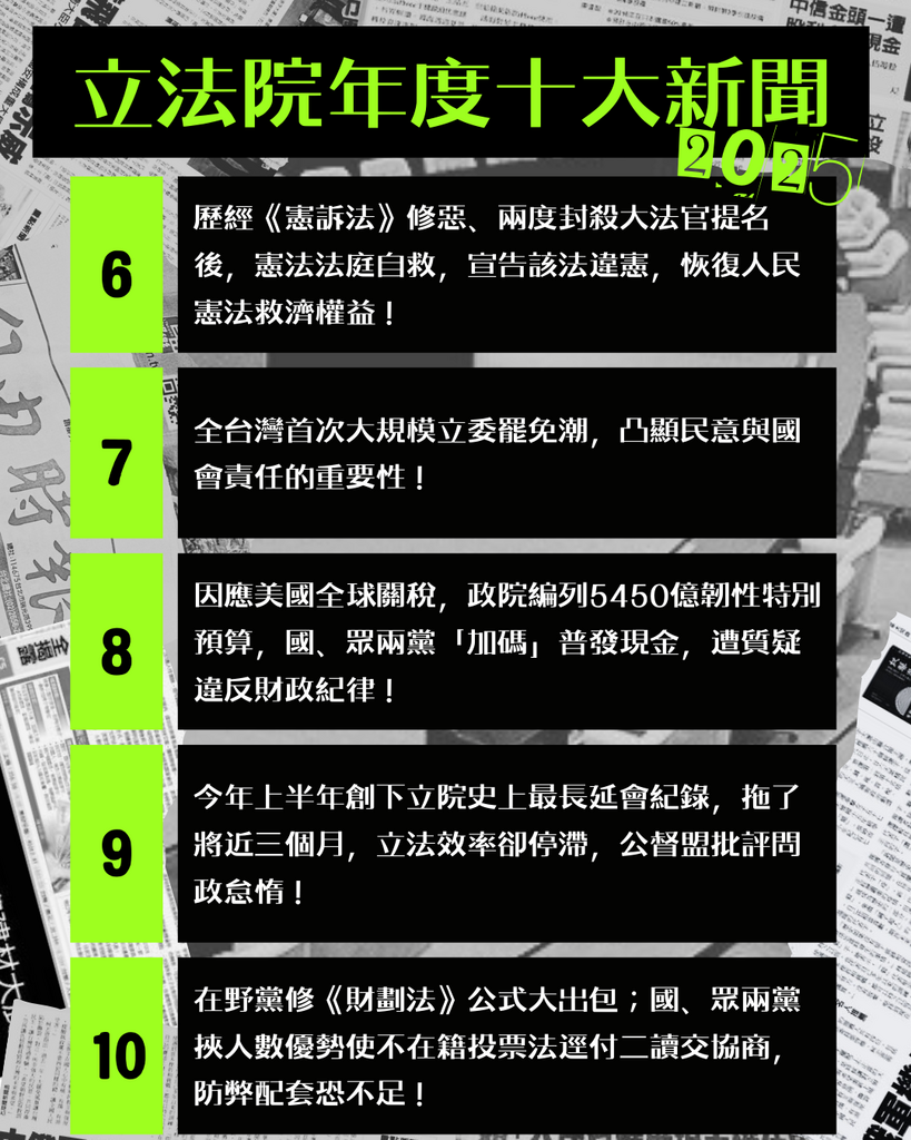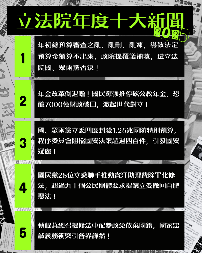 今年(2025年)十大新聞由「114年初總預算審查之亂,亂刪、亂凍,導致法定預算金額算不出來,政院提覆議補救,遭立法院國、眾兩黨否決!」從上百則立法院新聞中,獲得76%的得票率,是今年台灣公民對立法院最印象深刻的事件;年初立院總預算審查,在野黨立委提出上千筆亂刪、亂凍的提案引起社會高度反彈,許多預算提案存在多項明顯疏失,包括提案理由不清、刪減金額與機關名稱誤植、金額計算錯誤、重複刪減、刪減數超過預算數等問題;因此,在表決過程頻繁出現臨時撤案或修改內容的情況,凸顯本次預算審查過程的混亂。而如今,立法院更以占比不到萬分之一的「退休軍警所得替代率」預算未編足,卡住三兆攸關國防、社福、交通、科技發展的明年度中央政府總預算。