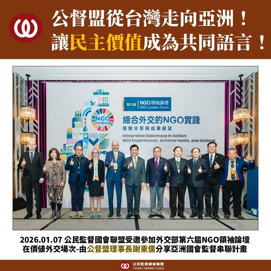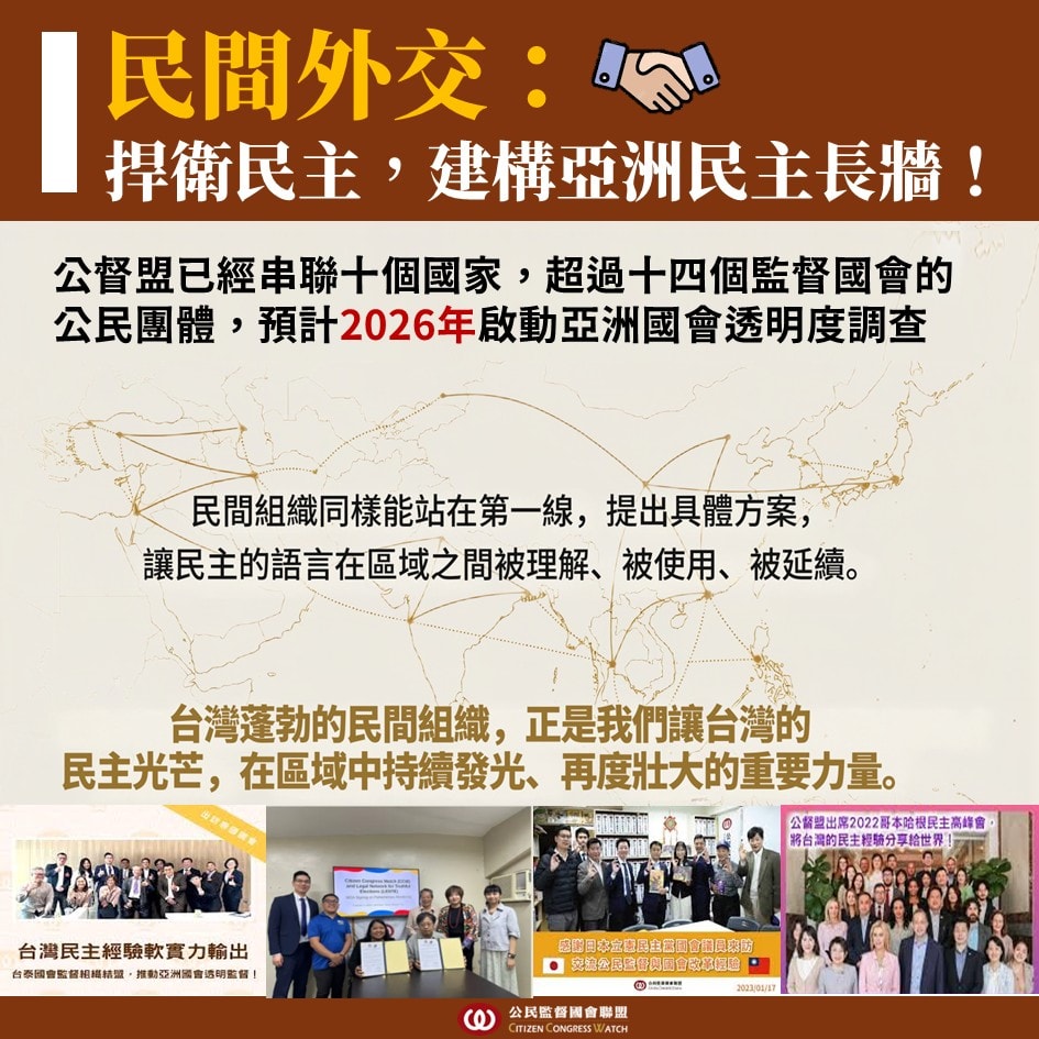 在全球民主倒退、威權再起的關鍵時刻,公督盟持續從「國會監督的實踐者」角色出發,將台灣累積近 18 年的民主監督經驗,轉化為亞洲公民社會可以共同使用的公共資產。