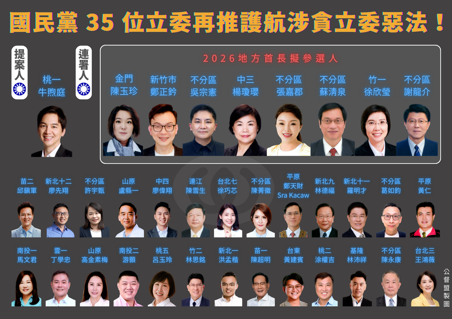 公督盟執行長張宏林痛批:「本會期立法院,國民黨團正事不做,卻準備為涉貪立委護航修法,在缺乏討論的情況下,強推多項違憲亂政、民主倒退的法案。特別是,有許多加入連署的國民黨立委平常根本不提案、不質詢,顯然不需要專業助理協助,憑什麼還要詐領這每個月50萬的助理費?」