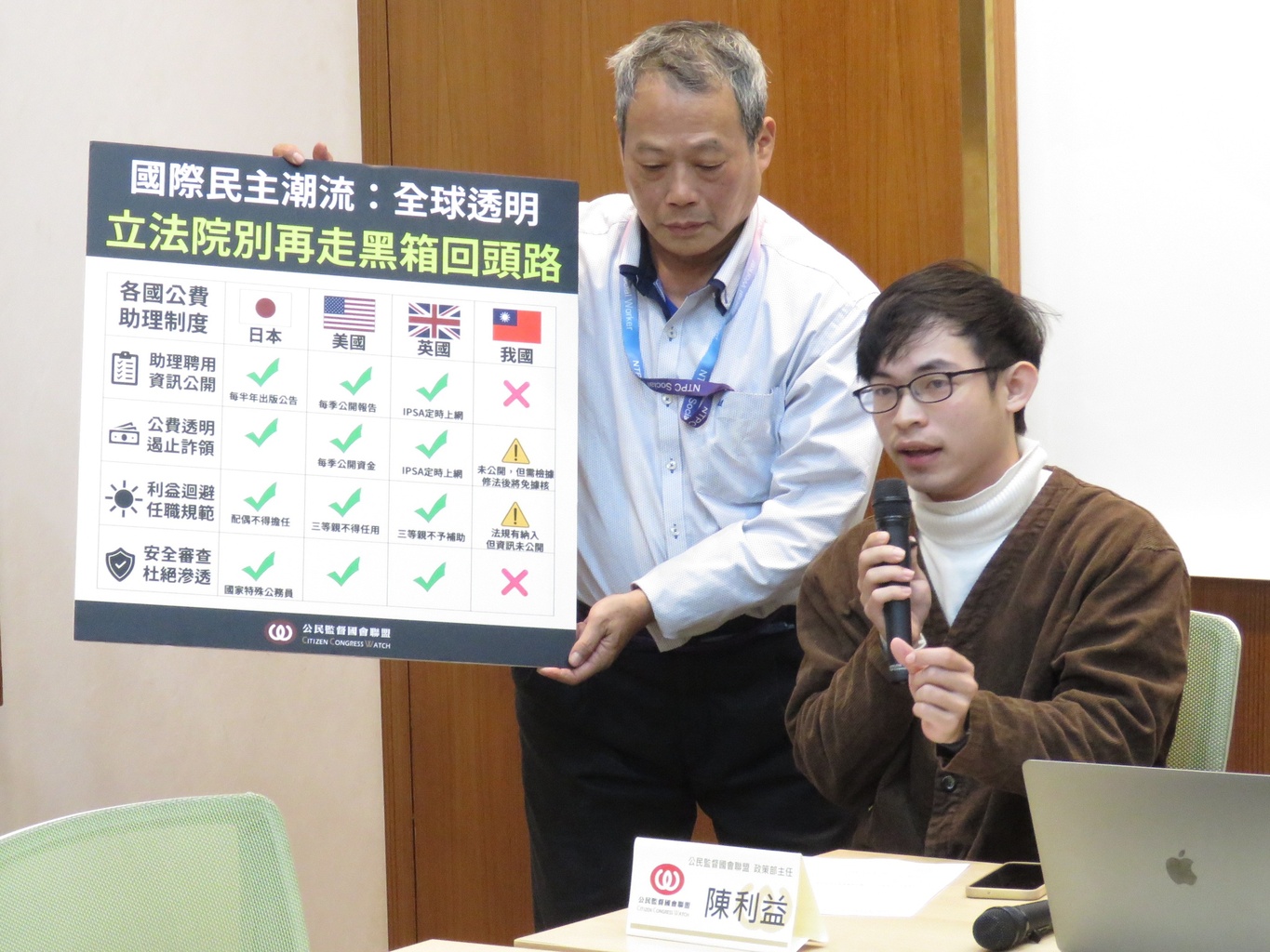 公督盟政策部主任陳利益強調:「在聘用資訊未公開、監管配套未建立前,卻先將助理費去監督化,形同拆掉公民監督的最後防線。結果不僅讓公帑流向無從查核,更使助理實際工時、加班情形與過勞剝削情形更加隱形。國民黨口口聲聲稱要「增加助理福利」,但在缺乏透明與究責機制下,只會成為看得到卻拿不到的空頭支票,合法化過勞與不當差別待遇,徹底背離勞權改革初衷。」