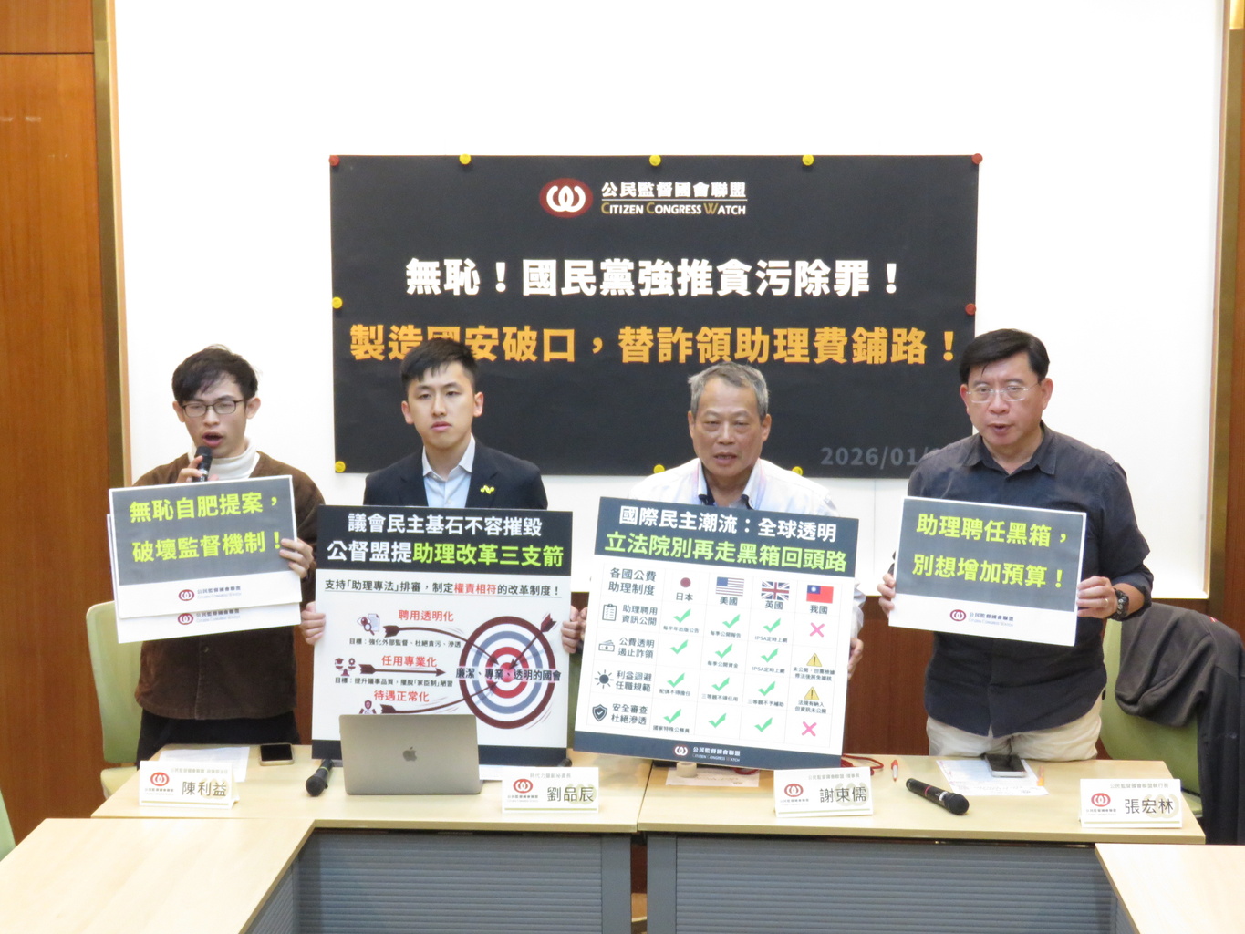 公督盟政策部主任陳利益指出,本屆國民黨團是有系統地拆解公費助理制度的監督基礎。從先前陳玉珍版本主張助理費「免檢據、統籌運用」,再到牛煦庭版本以「提高助理待遇」包裝,試圖淡化社會疑慮,本質上都是為了顛倒公帑性質、鬆動法律責任、削弱監督機制,給涉嫌貪汙立委交代!