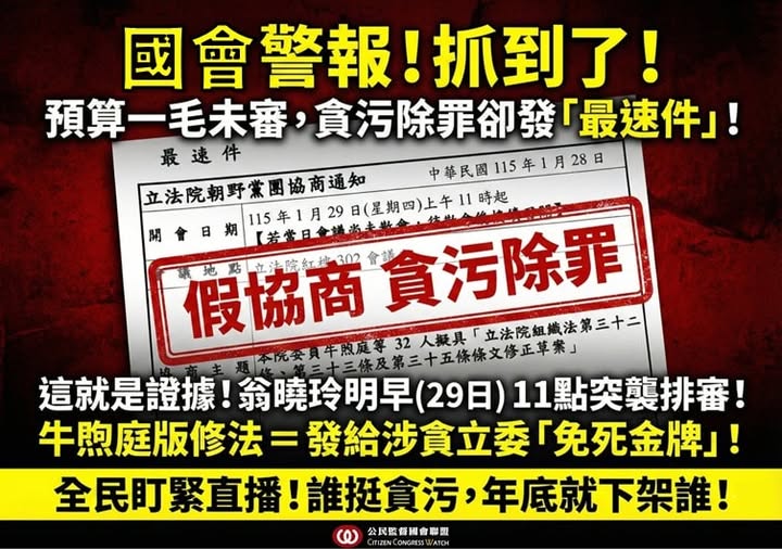 📌 假協商、真過水!藍白膽敢投票支持貪污除罪三讀,選民必將淘汰貪腐政黨!