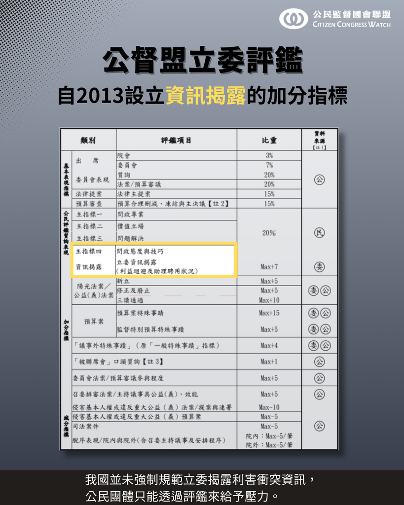 公督盟十八年以來透過立委評鑑推動國會改革,要求立委資訊揭露,供社會大眾檢視……STOP!