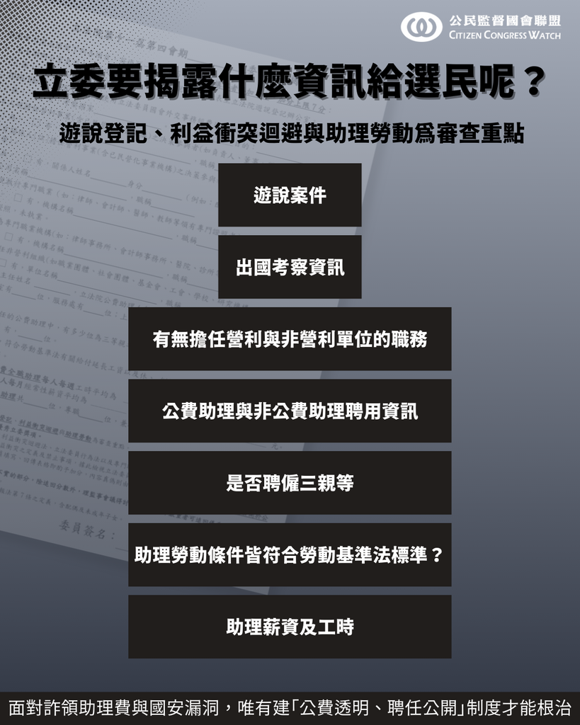 公督盟強調,揭露公費助理聘用資訊只是民主監督的第一步。由人民選出的立委月領19萬血汗納稅錢,本應受全民檢視,向選民負責,不該以抵制為名,行隱匿之實!