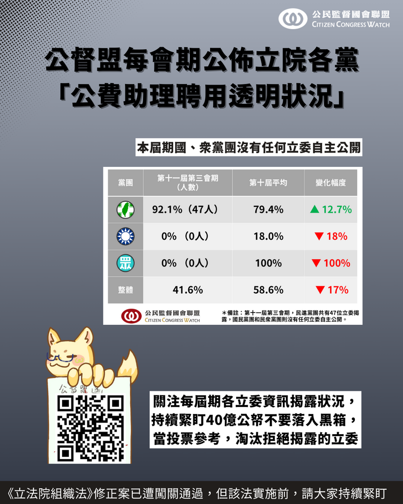 在該法實施前,公民朋友可以做的,就是持續緊盯每會期各立委是否有好好自律揭露資訊,公督盟會如往常定期公佈立院各黨的「公費助理聘用透明狀況」,邀請大家一同關注,確保 40 億公帑不要落入黑箱,淘汰拒絕公開利益衝突資訊的立委!