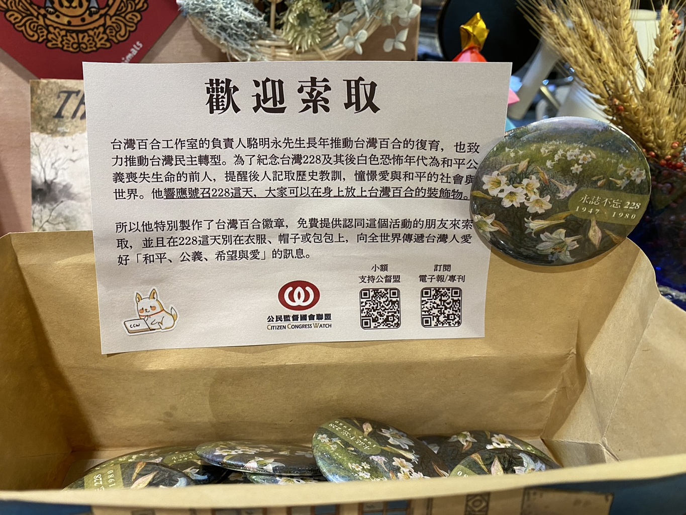 今天已將駱明永先生送給公督盟的一些台灣百合胸章,寄放在思享森林咖啡共享空間 ,一進去就可以看到囉~非常歡迎有興趣的夥伴來領取,參與此紀念行動!!✨