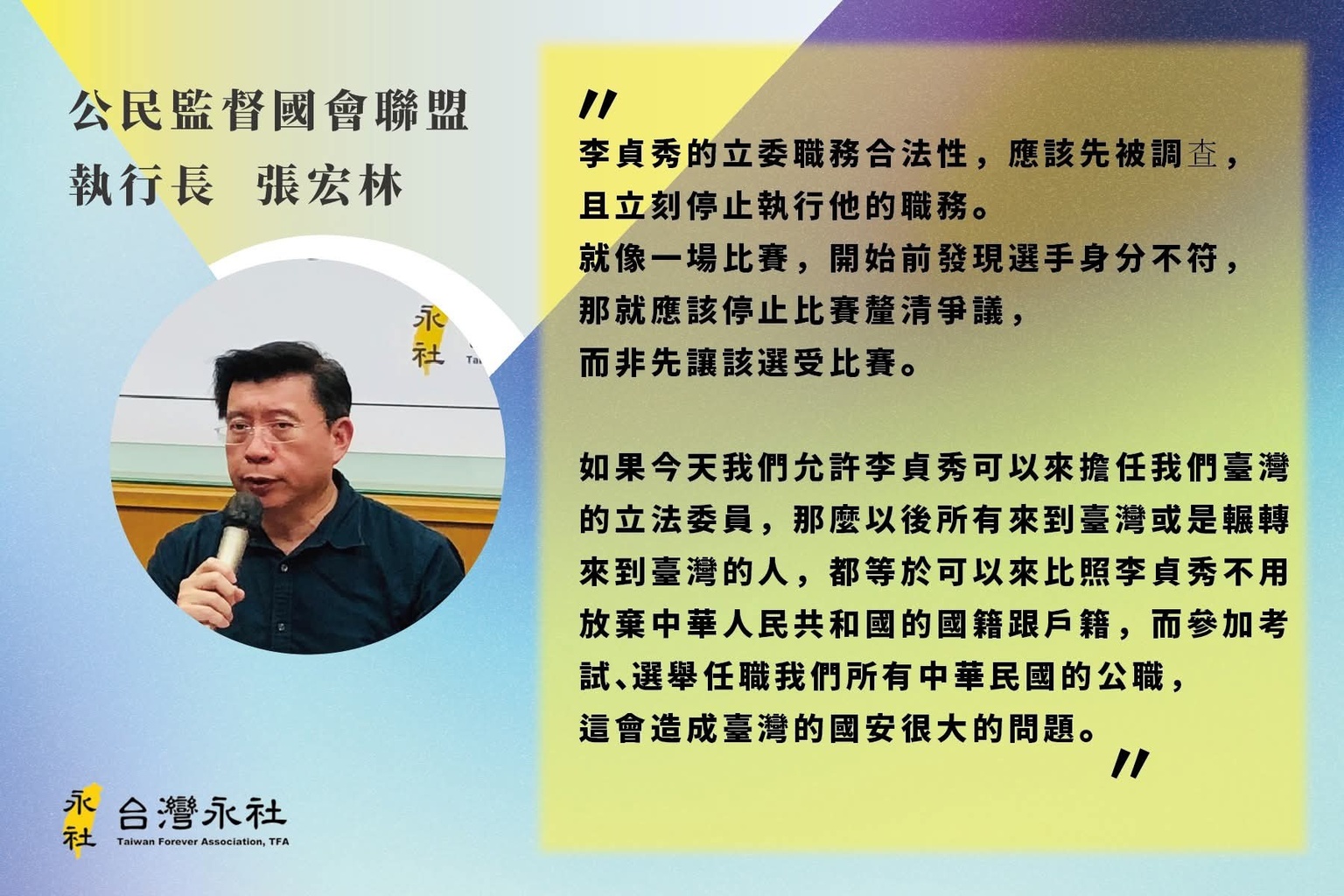 公督盟執行長|張宏林:「就像比賽,開始前發現選手資格不符就該下場!藍白陣營正用『同屬一中』模糊國籍問題,這會給中共藉口將台灣問題內政化。若李貞秀不必放棄國籍就能當立委,台灣所有公職都將門戶洞開!」