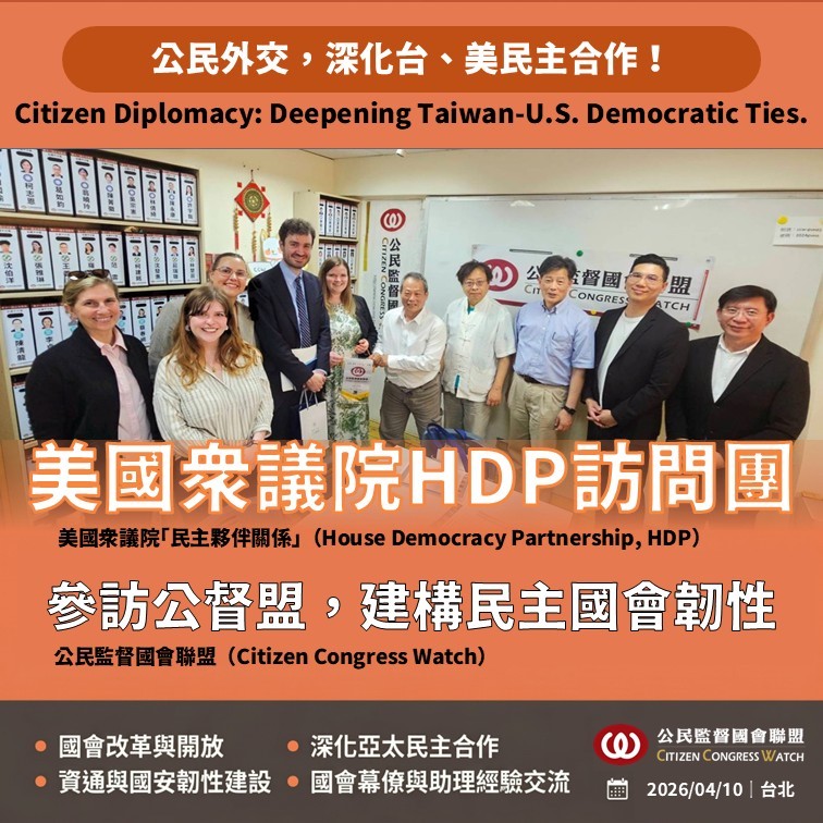 本月 10 日,美國眾議院「民主夥伴關係」(House Democracy Partnership, HDP)辦公室訪問團特地拜會公民監督國會聯盟(公督盟,Citizen Congress Watch)。雙方聚焦臺灣立法院結構性改革、國會資安防禦及推動國際民主網絡串聯進行深度對話。