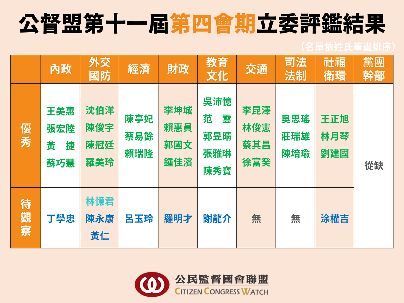 公民監督國會聯盟(公督盟)長期致力於推動國會改革和透明化,自2007年成立(立委席次減半)以來,就持續藉由「立委評鑑」監督國會議員表現,至今已經持續19年,總共累積36次立委評鑑的經驗,是我國立委評鑑的第一品牌,公督盟的立委評鑑作業流程相當嚴謹,分為初審、複審兩階段,前後歷時半年,經歷國會助理評鑑說明會、21場初審會議討論,並有2378人次參與公民評鑑,最終在04月11日(六),公督盟立委評鑑-複審大會中,依初審小組的審查報告,議決出30位優秀立委、8位待觀察立委,而優秀黨團幹部,則因預算會期整體表現失能而從缺。