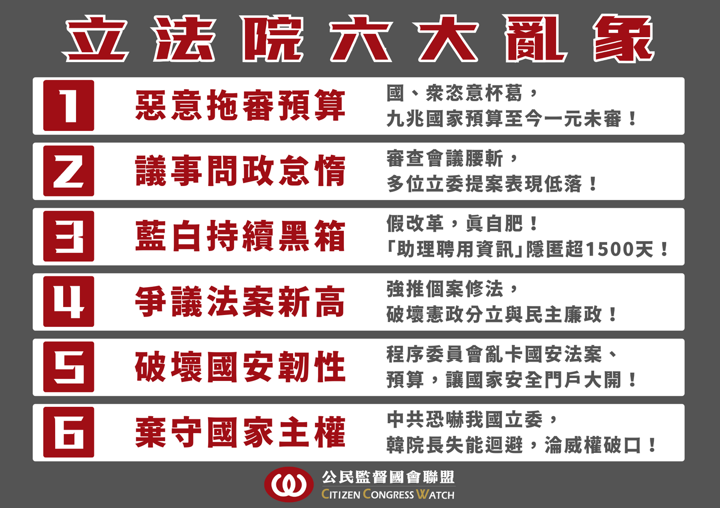 本會期國會屢次踐踏程序正義,不僅史無前例地將攸關全民福祉的總預算當作政治肉票,導致國家政務陷入空轉危機;更在《立法院組織法》與《不當黨產條例》等高度政治爭議法案上,嚴重違背「委員會中心主義」,運用強行闖關的方式製造社會對立。公督盟嚴正呼籲,韓國瑜院長主持議事必須絕對中立,應積極居中化解預算與法案僵局,而非放任程序暴力與惡意杯葛上演。若不守住程序正當性的底線,立法院將徹底淪為「特定政黨的政治秀場」,而非「人民的國會」!