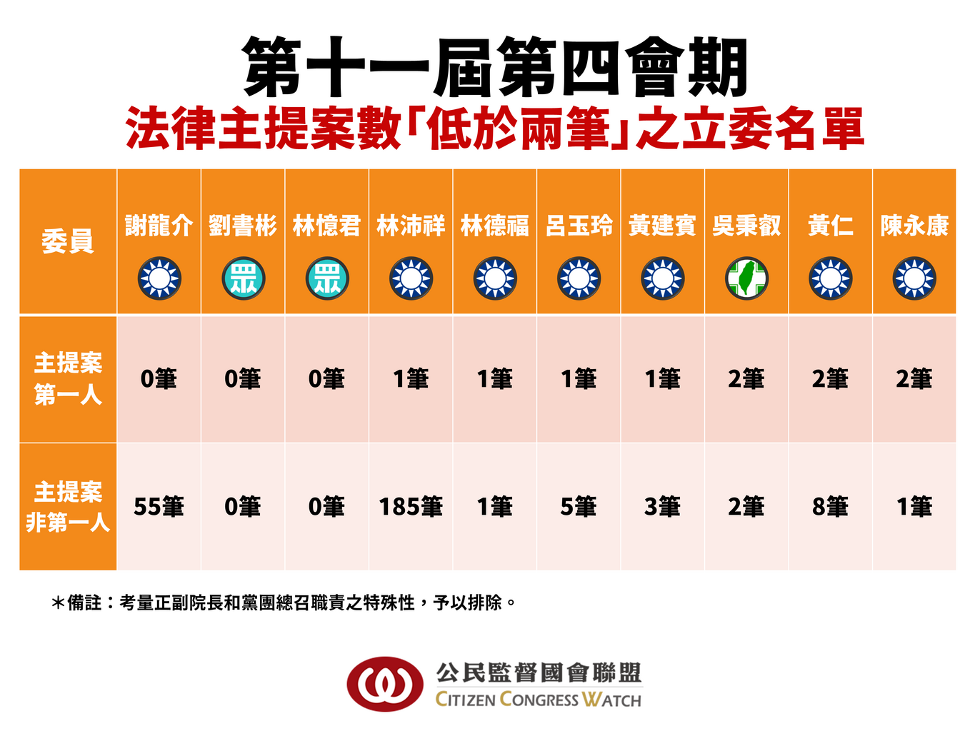 另外,在公督盟立委評鑑中,反對立委跟風抄寫提案;因此,基本評鑑指標上,設有採納上限,幾乎約七成立委辦公室都能達標,然而,檢閱表(三),國民黨(台南市長候選人)謝龍介委員、民眾黨林憶君、劉書彬委員,整整一個會期主提案數竟徹底「掛零」!立委月領超過二十萬公帑,卻連一條法律修正案都研擬不出來,這種「零產出」的立法表現實在愧對選民託付,此外,部分立委透過上百件的「共同提案」來洗產量,此種搭便車的投機行為,嚴重破壞我國立法專業性和民主問責!