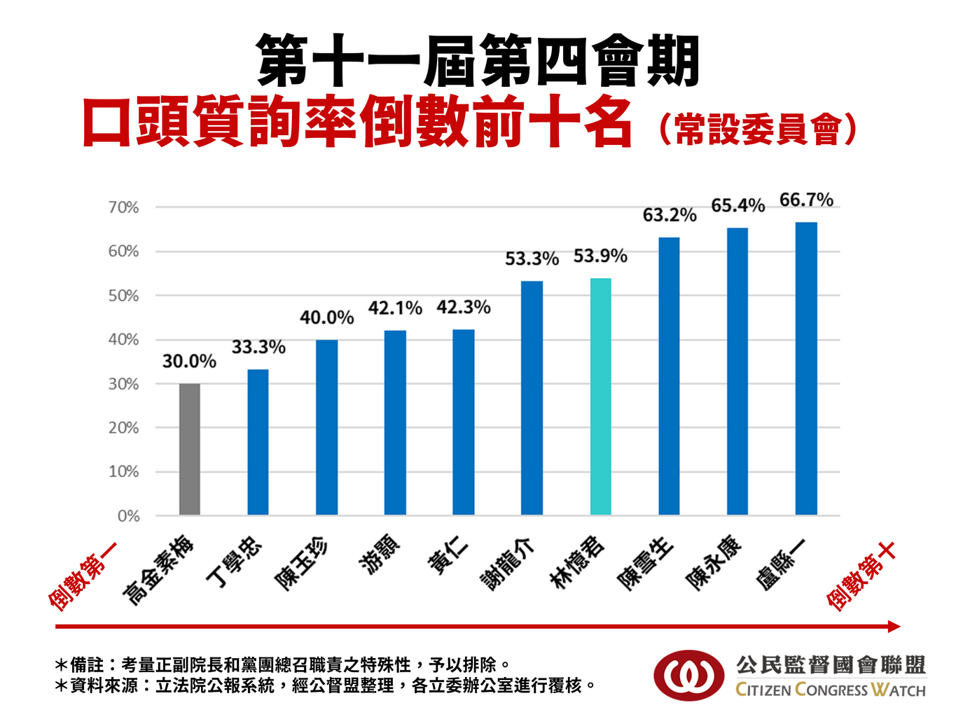 若進一步檢視表(二),本會期各委員會,在口頭質詢率的部分,考慮立法院長、副院長,以及各黨團黨鞭工作之特殊性,予以排除後,可以發現,儘管在野黨立委主張延會,卻有許多立委自動放棄一半以上的質詢機會。其中,高金素梅委員口頭質詢率僅 30% 位居末座;丁學忠、陳玉珍、游顥及黃仁等委員,質詢率亦低於五成,體現出「要去開會的是你,不去開會的也是你」的傲慢心態。