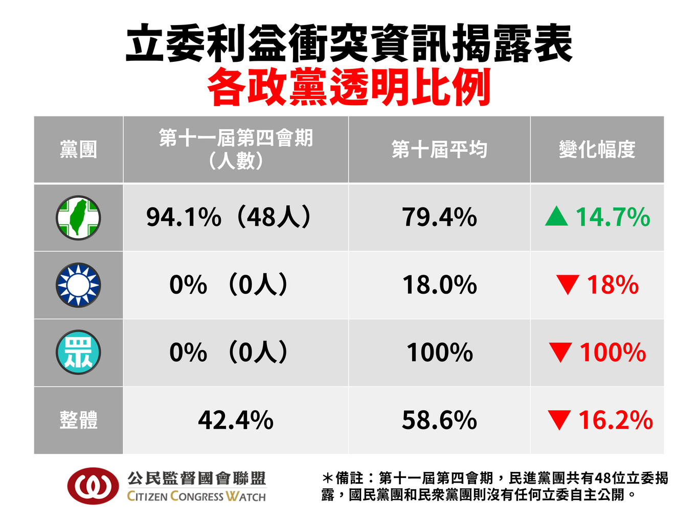 本會期總計僅有48位立委自主揭露辦公室公費助理聘用資訊(各政黨繳交情況見下方表四),值得注意的是,國民黨立院黨團從第十屆第四會期開始(2021年),用黨團決議限制黨籍立委將國會助理聘用、立法委員兼職…等資訊公開給民眾檢視,而民眾黨過去高喊「公開透明」,本屆卻是背棄進步價值,沒有任何的立委自主上網向社會揭露!這種跨黨派的集體隱匿,已讓國會淪為滲透目標!